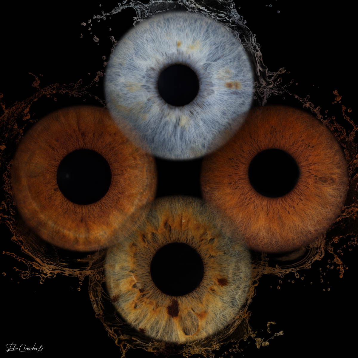 Offrez un cadeau mémorable pour un groupe ou une famille : le portrait de quatre iris, sublimé par un traitement graphique exclusif, photographié en macro sur fond noir au studio Chambre 27, à Morlaix en Finistère.