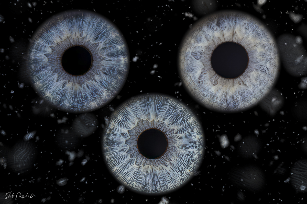 Offrez un cadeau insolite pour trois personnes : le portrait de trois iris, sublimé par un traitement graphique exclusif, photographié en macro sur fond noir au studio Chambre 27, à Morlaix en Finistère.